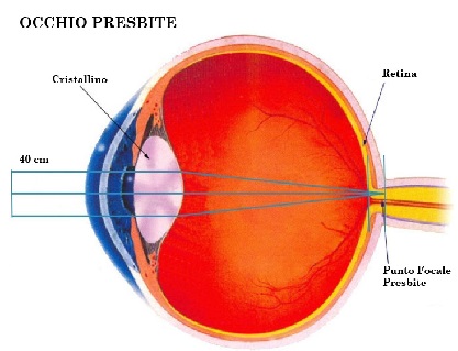 La presbiopia consiste nella progressiva e naturale incapacità dell'occhio di mettere a fuoco gli oggetti più vicini. Dipende da una perdita di elasticità del cristallino che si verifica con l'avanzare dell'età, generalmente dai 40 anni in su. La presbiopia non rientra fra i difetti di refrazione, le cosiddette ametropie, a cui appartengono invece miopia, ipermetropia e astigmatismo. È, infatti, dovuta a una perdita della capacità accomodativa naturale dell'occhio, vale a dire la flessibilità del cristallino che modifica la sua forma per mettere a fuoco gli oggetti più vicini e più lontani. Con il passare degli anni la parte centrale del cristallino (nucleo) perdeacqua, si indurisce e aumenta l'indice di rifrazione. Ciò comporta un'incapacità del cristallino di adattarsi con un allontanamento del punto prossimo, il punto di messa a fuoco più vicino.